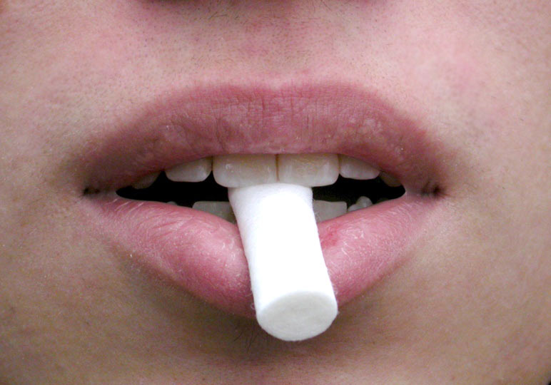 3. Anschließend legen Sie eine Watterolle zwischen die oberen und unteren Schneidezähne und laufen 5 Minuten damit herum, wobei Sie mehrfach die Laufrichtung wechseln.